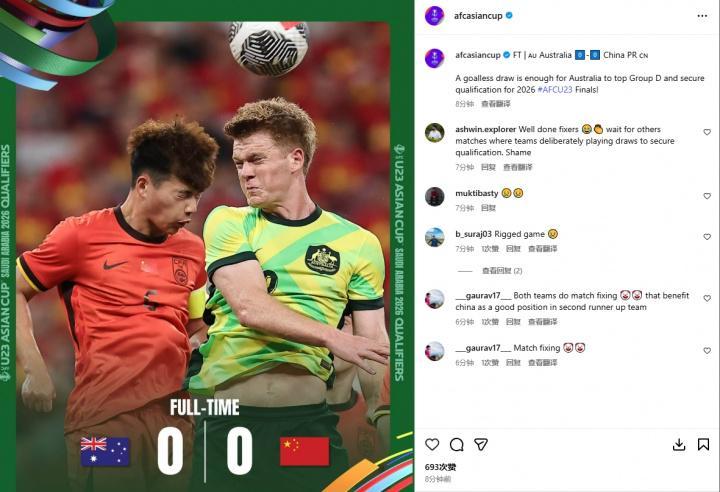 比赛结束后亚足联发文报告战果,评论区寥寥无几,但基本上全是嘲讽,显然球迷对于这场球不买账,认为是假球,纷纷留言被操纵的比赛,亚洲亚足联真丢脸,假球。其实球迷之所以这样讲,主要原因在于澳大利亚下半场基本上不怎么进攻,踢得也畏畏缩缩,也害怕我们进球,最终以平局的局面结束比赛,难免惹争议。