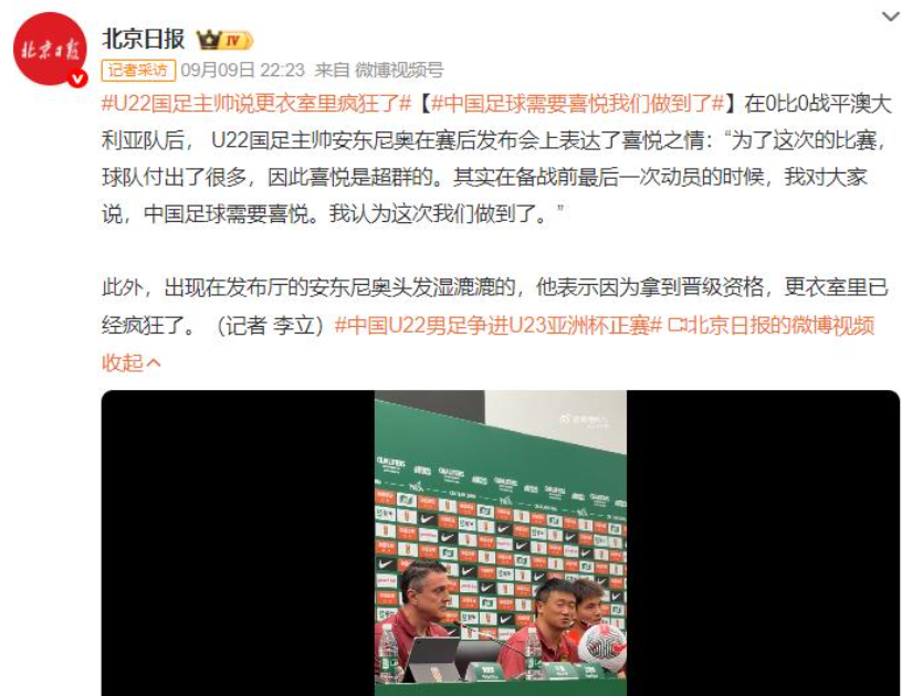 作为球队的核心王钰栋则也十分清醒,他表示首先王爱栋表示安帅也非常疯狂,大家也都非常开心。不管怎么说,国足不用看别人的脸色,也非常感谢澳大利亚的默契配合,才让国足拿到这一分。从整场比赛来看,中国球员执行战术还是非常彻底达到目的,没有什么比这更值得开心的。