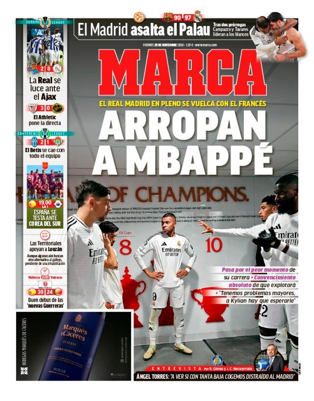 《马卡》报和《阿斯》报时常会出现一些不约而同的头版头条和专题报道,这后面往往来自老佛爷的授意。例如11月29日的这次统一行动。《马卡》报头版说,全皇马都在捍卫姆巴佩,但是配图很有意思,是球员通道里姆巴佩背靠墙壁,站在一群球员中间,看上去这是队友们团结在姆巴佩身边,其实视频可以证实,当时队友们正在互相鼓励,唯独姆巴佩被彻底冷落了。倒是《阿斯》报头版配图略更自然,是贝林厄姆在场上对姆巴佩摸头鼓励。